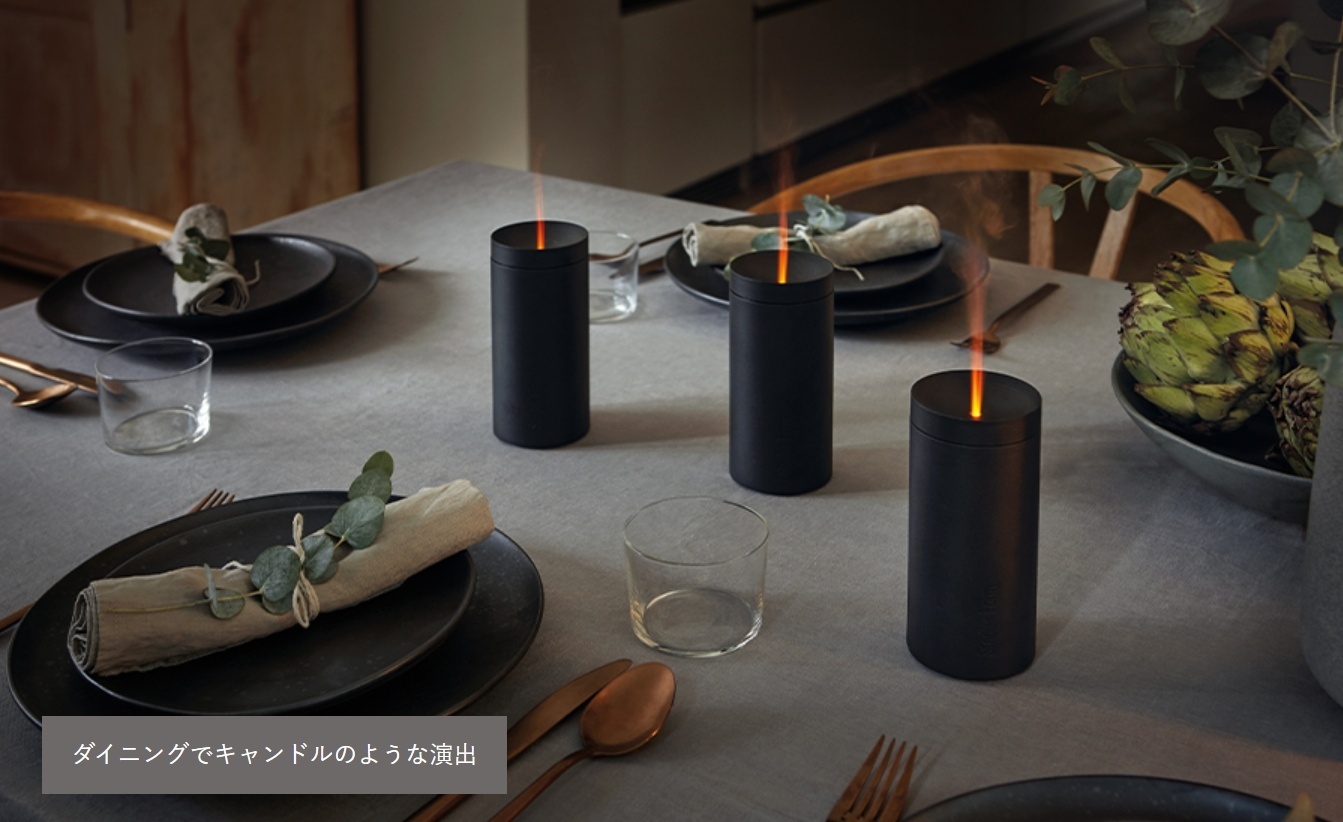 細長いラウンドのフォルムと、アンバーカラーのLED ライト がキャンドルの炎ような演出をします。